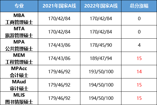 但是,2022年考研的情況卻讓很多人“大跌眼鏡”……今年只有MBA(含EMBA)與MTA國家線保持不變,其他專業的國家線都有不同程度上漲,MEM、MAud、MLIS總分甚至上漲15分!