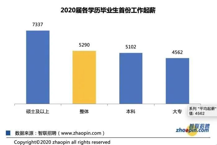 此外,本科和碩士應屆生在薪資方面也存在差距。在智聯招聘2020年發布的一份就業報告中,可以看出碩士及以上學歷的畢業生首份工作平均起薪高于整體及本科與大專學歷的學生。