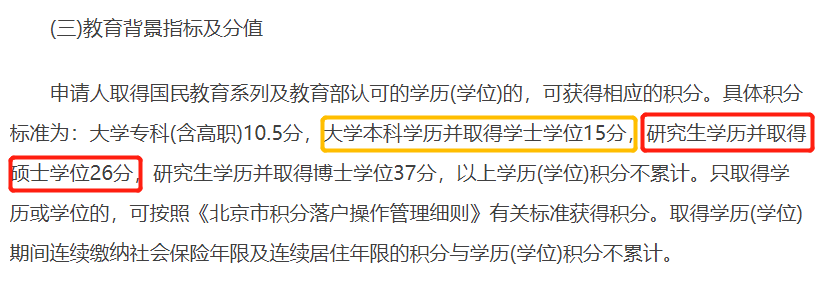 比如,在北京獲得研究生學歷并取得碩士學位可以直接獲得26分落戶積分,這個分數比本科學歷直接高出11分!