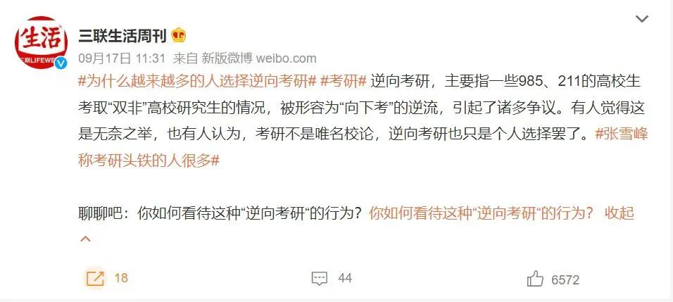 逆向考研主要描述的是“雙一流”高校本科生考取“雙非”高校研究生的情況,被形容為“向下考”的逆流。