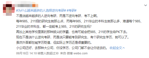 不少人認(rèn)為,“逆向考研”的原因在于學(xué)歷的內(nèi)卷。碩士學(xué)位成為當(dāng)前就業(yè)市場的基準(zhǔn)門檻早已不是新鮮事。在激烈的競爭下,很多人考研的核心目的已經(jīng)變成解決學(xué)歷問題,無所謂學(xué)校“出身”了。
