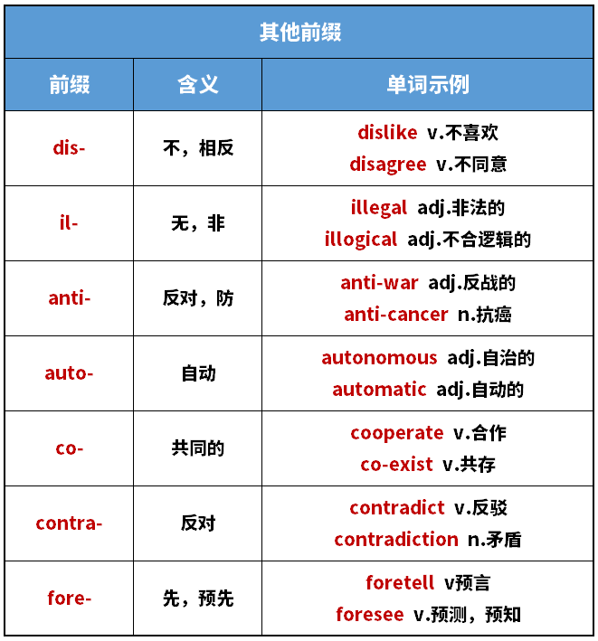 前綴往往會(huì)決定一個(gè)單詞的發(fā)展方向,簡(jiǎn)單類比可以看為漢字的偏旁。前綴有上下、高低、快慢、起伏、遠(yuǎn)近、好壞、數(shù)字、數(shù)量等等。這里給大家羅列了英語常見的幾種前綴——方向前綴,數(shù)量前綴,其他前綴,并列舉了一些高頻詞,輔助大家記憶。