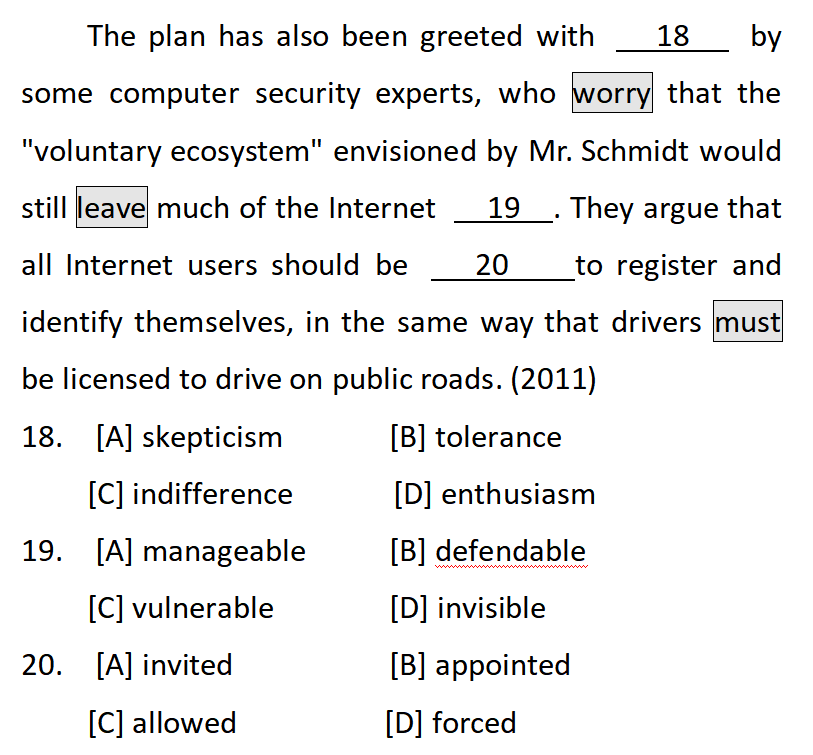 第18空,前半句說“這項計劃受到安全專家 反應。”僅從這句,并不能得出答案。從后半句的“worry”可知,計算機專家對這個計劃是擔憂的,所以此題應該填的是專家對這項計劃不是那么有信心,即是worry的近義詞。那我們來看選項,A批評;B容忍;C漠不關(guān)心;D熱情。哪個是worry的近義詞呢?選項A,因為專家對這個計劃有后面的這些擔憂,所以持質(zhì)疑態(tài)度。