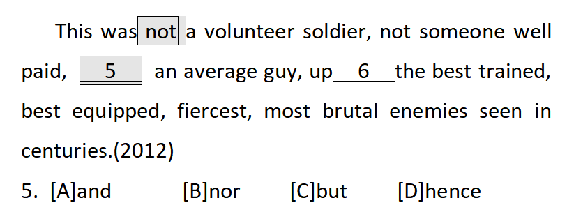 空格前講,“他不是一個志愿兵,薪資也不優(yōu)厚”,空格后講,“一個普通人”。前后邏輯相反,因此是對比關(guān)系。因此用“not...but...” “不是……而是……。”