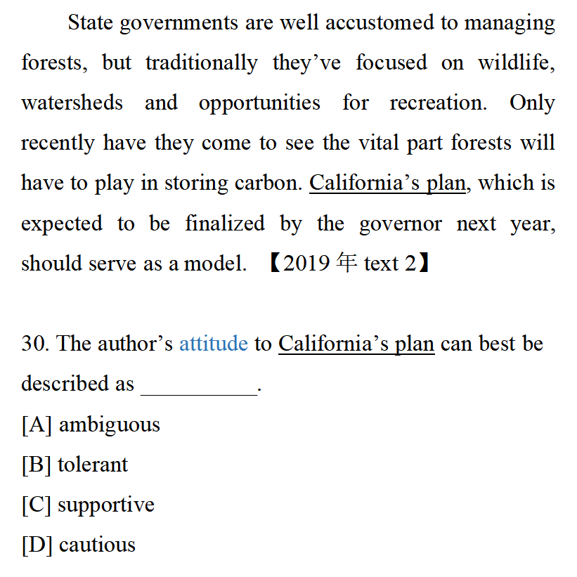【注意】如作者對文中事物不表態,或者既有肯定又有否定,答案往往是“客觀的”,如2012年第3篇35題,作者對gene patenting未表態,所以選objective.