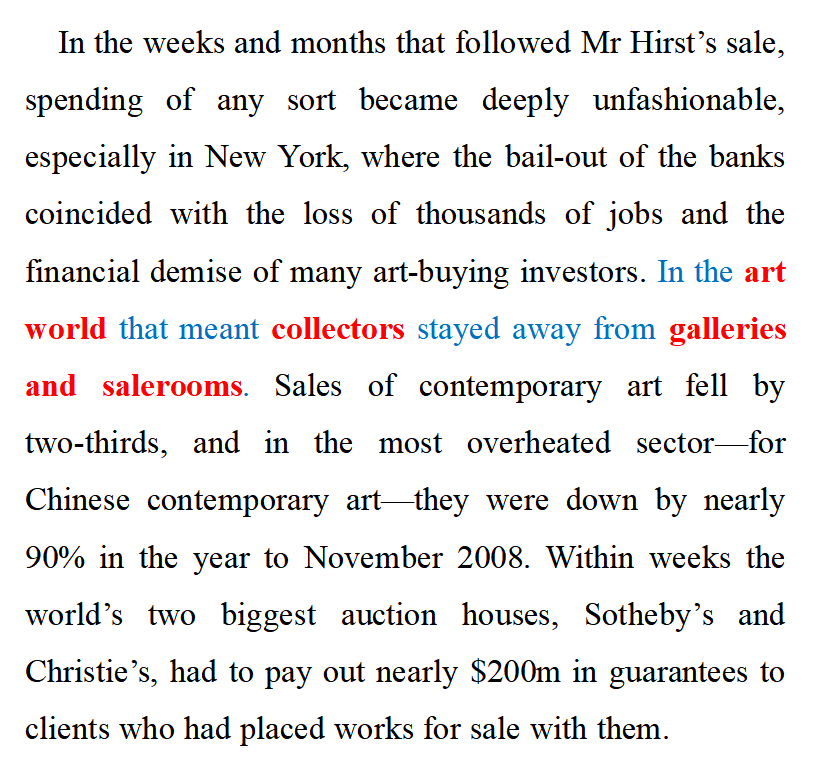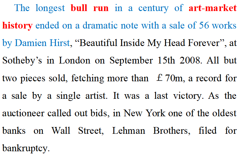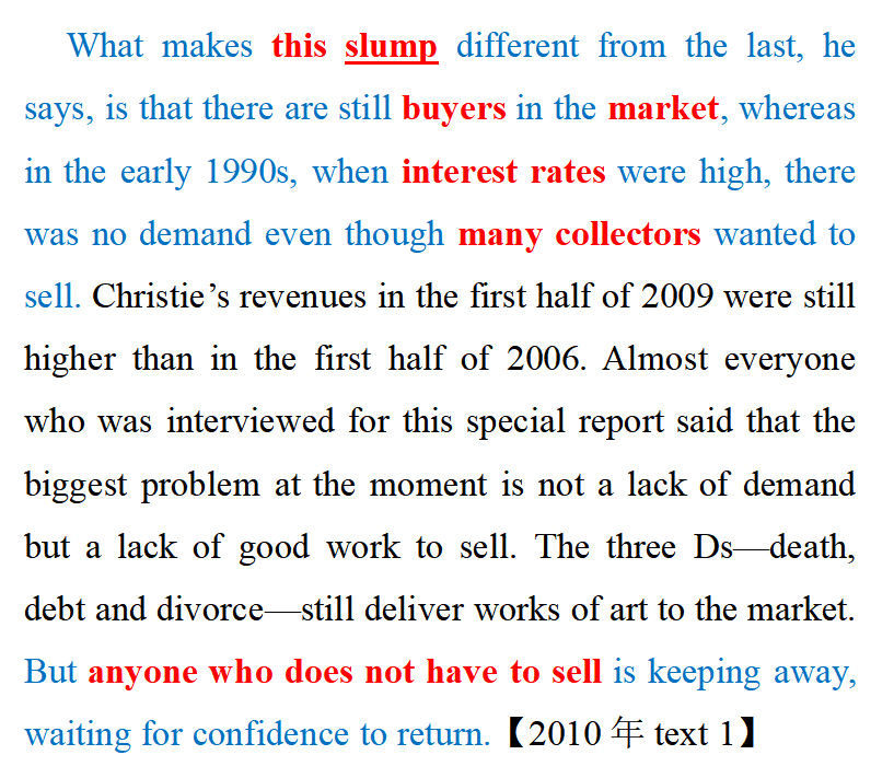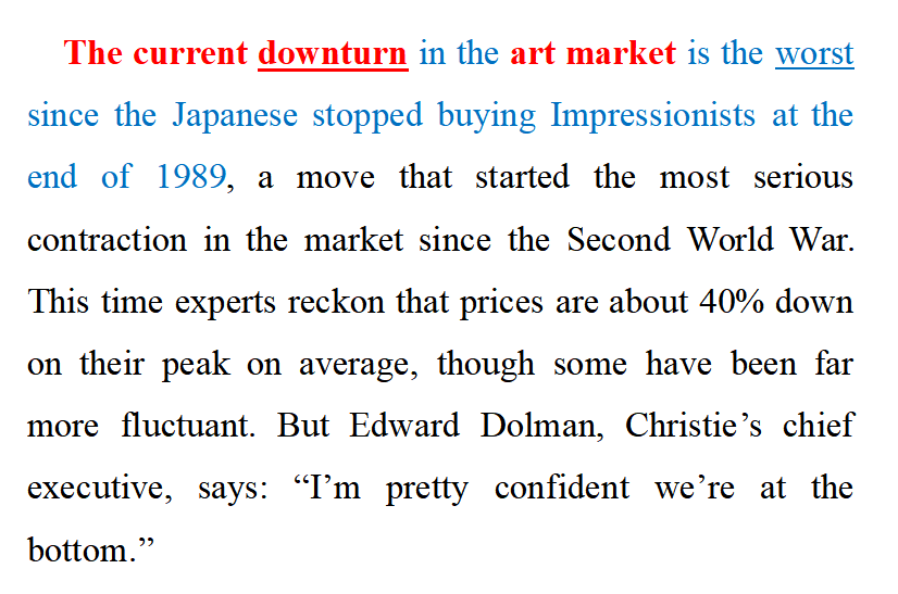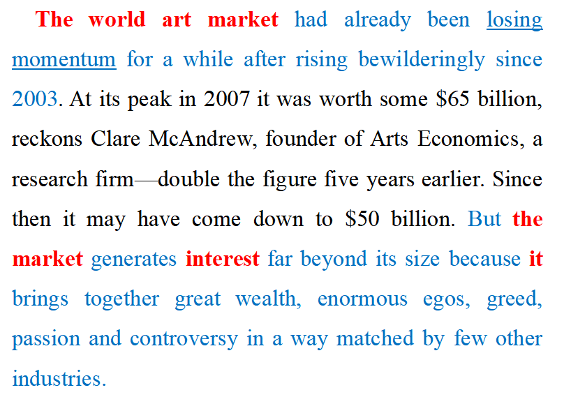 step 2: 找到每句主旨句中出現最多的名詞/名詞詞組為art market,出現了5次;并可以通過losing momentum, downturn, worst, slump等負向詞可以判斷作者的態度方向為“負向”