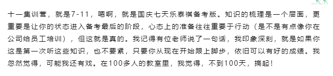 對于考研黨特別是在職備考的同學(xué)來說,國慶是最后一個復(fù)習(xí)黃金期。平時只能抽出零散的時間學(xué)習(xí),而國慶的小長假給同學(xué)提供了一個系統(tǒng)的復(fù)習(xí)時間,據(jù)往期學(xué)員反饋,他們有整塊時間學(xué)習(xí),覺得有收獲、心里更踏實。