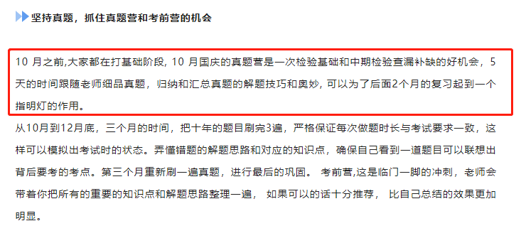 10月份大部分學(xué)員都進(jìn)入實戰(zhàn)階段,知識點基本掌握但沒有形成的做題思路,導(dǎo)致復(fù)習(xí)不得章法,效率低下。真題營將按照模塊、題型、知識點等進(jìn)行講解,無論是起步較晚還是已經(jīng)系統(tǒng)復(fù)習(xí)完所有知識點的同學(xué),都是一次查漏補缺、檢驗學(xué)習(xí)成果的好機(jī)會。