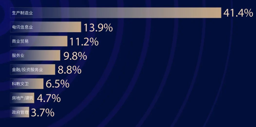 金融服務、生產制造業、科技/新媒體/電信、房地產、零售/貿易、服務行業、IT/電子/互聯網/通信等。