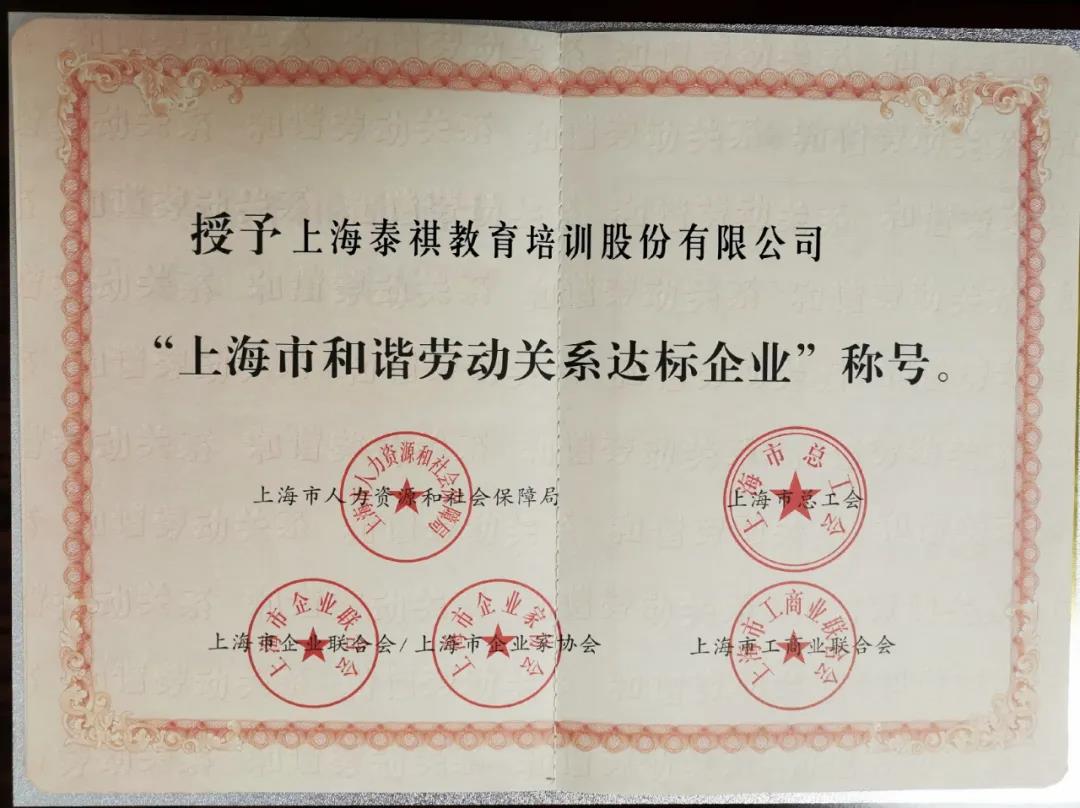 近日,上海泰祺教育培訓股份有限公司被上海市人力資源和社會保障局、上海市總工會、上海市企業聯合會/上海市企業家協會、上海市工商業聯合會聯合授予“上海市和諧勞動關系達標企業”稱號。