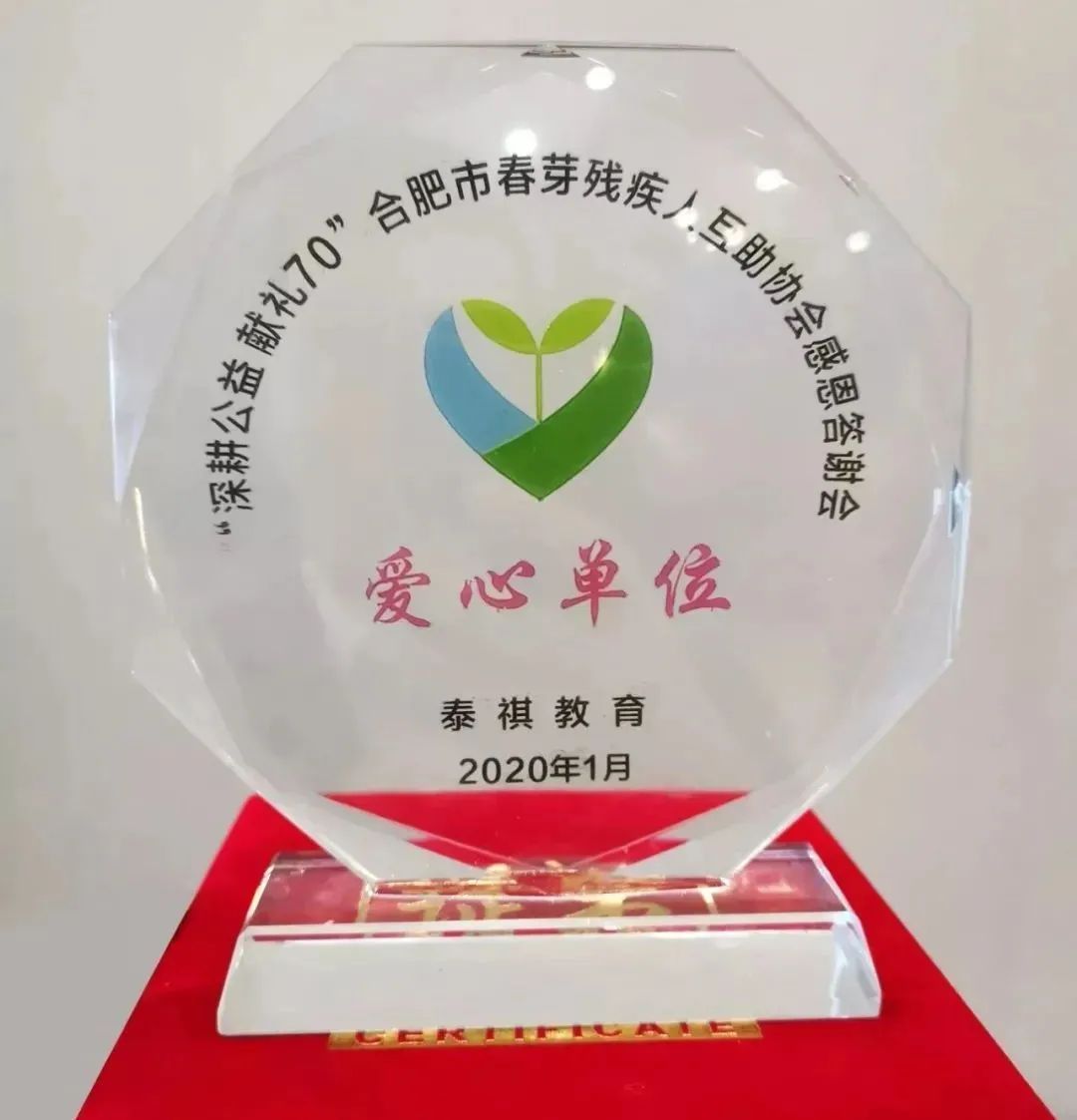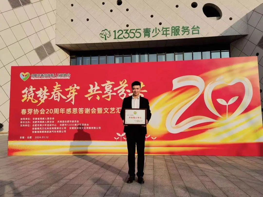 2024年1月12日,泰祺教育應邀參加“筑夢春芽 共享芬芳”春芽協會20周年感恩答謝會,協會為其頒布了“杰出愛心單位”獎,以感謝泰祺對合肥市春芽殘疾人互助協會自閉癥兒童康復做出的持之以恒的幫助和貢獻。泰祺教育區域校長孟新凱先生受邀出席答謝會并接受了頒獎。